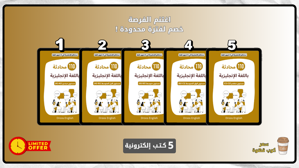 هي باقة مكونة من خمسة كتب إلكترونية متكاملة، كل كتاب يحتوي على 110 محادثة واقعية، مصممة خصيصًا لتناسب كل مستوى من مستويات اللغة الإنجليزية، من المبتدئ (A1) إلى المتقدم جدًا (C2).